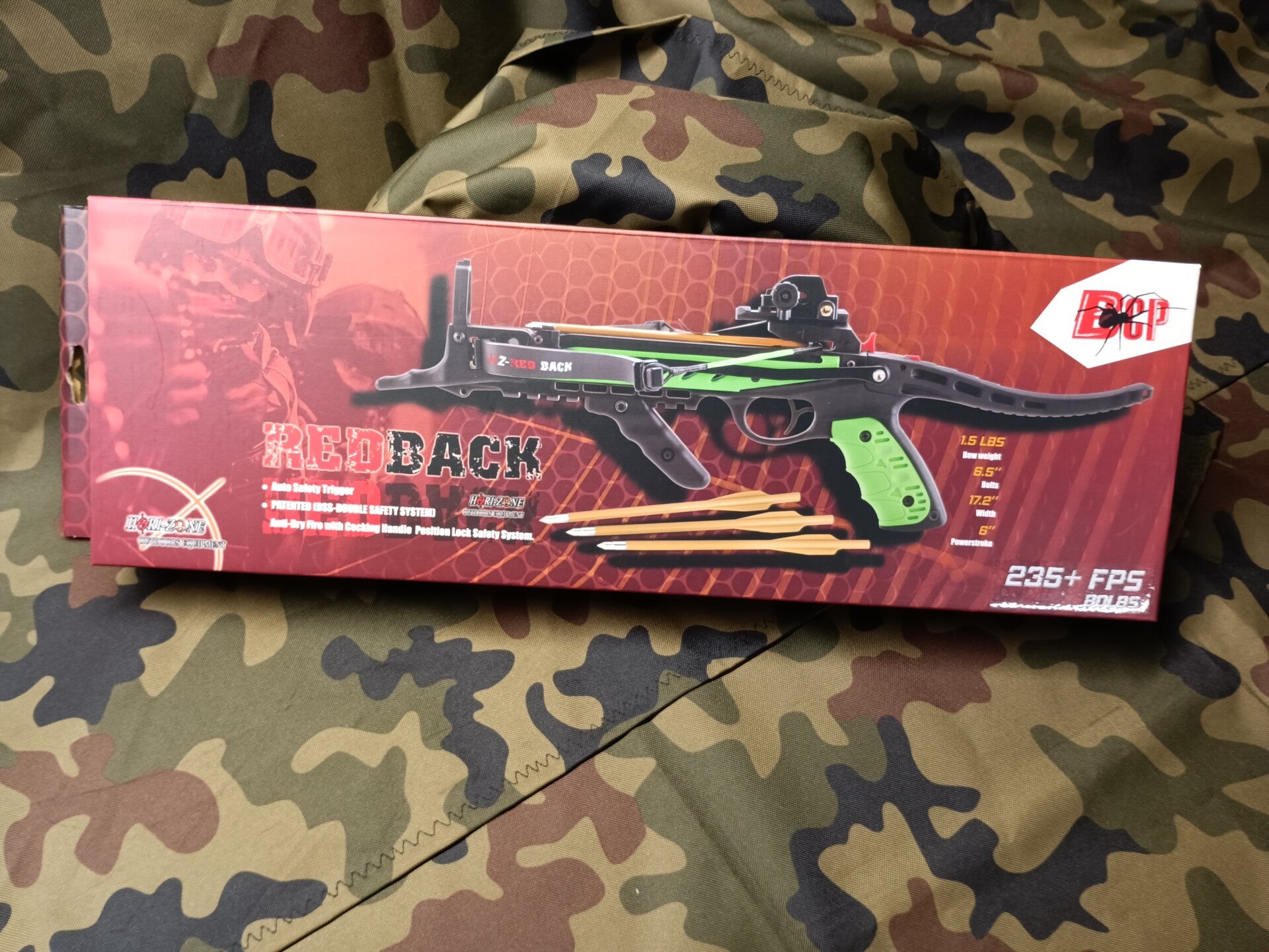 Die Pistolenarmbrust Red Back ist eine der stäksten auf dem Markt. Sie erreicht über 235 FPS und besitzt ein richtiges Schloß.