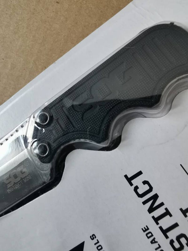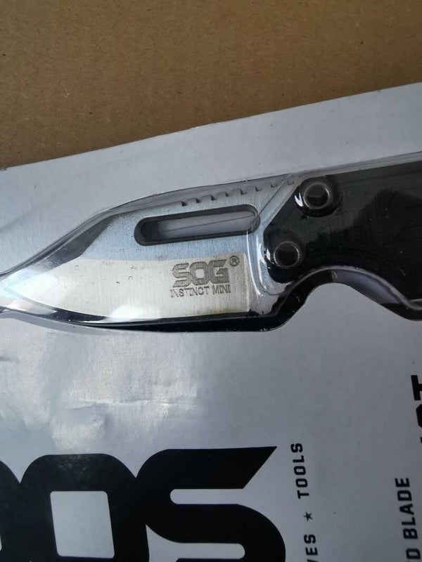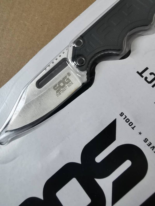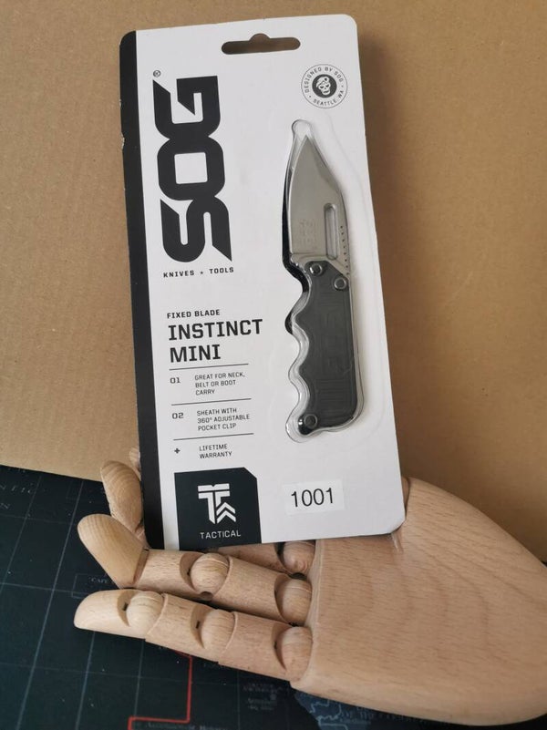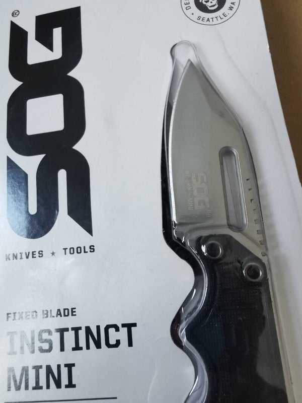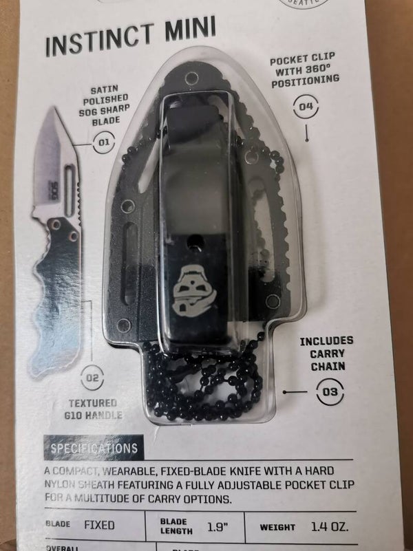 SOG Instinct Mini Neckknive mit hochwertiger Kunststoffscheide, Kette und 360°drehbarer Gürtelclip.